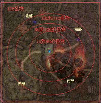 从50开始,可以在蒙塔4层(不知道为什么比凯经验高)一直刷到60,然后去乌诺斯城(60进入),再然后马尔巴,这几个地图一直刷到75级。75级可以去恶魔平原了,恶魔平原的怪物分布就厉害了,从75到125的怪都有。下面的图就是怪物的大概分布。