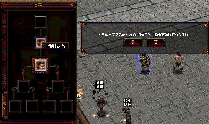 如果徒弟要解除师徒关系只需要将和师徒中间的线点击会显示是否中断师徒关系,不一定要见到师父解除师徒关系